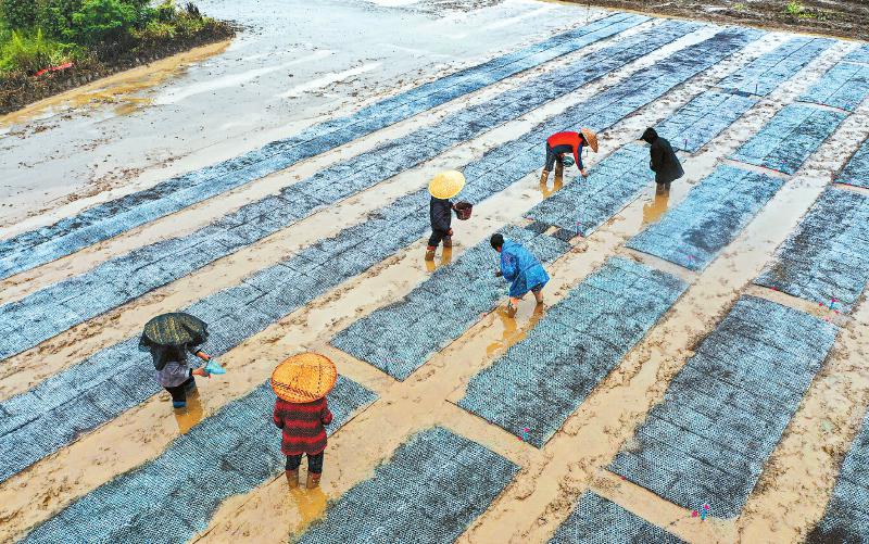四月十四日,在天府现代种业园,农户忙着播种育秧。一块一亩地的秧田,共有五十五个入围水稻品种同田育秧。记者 何海洋 摄
