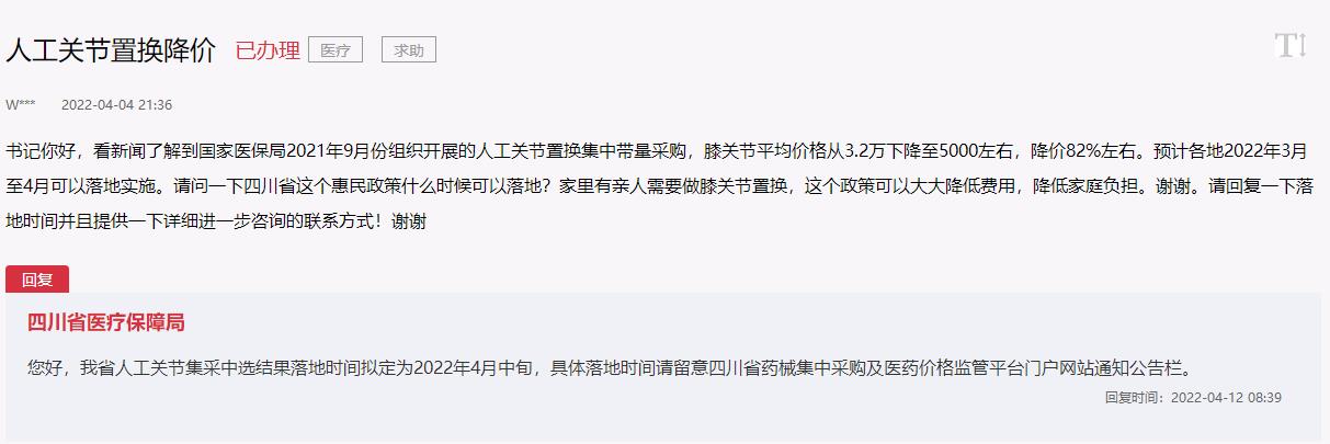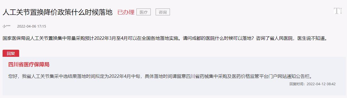 群众在人民网“领导留言板”留言及四川省医疗保障局回复截图收到留言后,四川省医疗保障局进行了统一回复。回复表示,四川省人工关节集采中选结果落地时间拟定为2022年4月中旬,具体落地时间请留意四川省药械集中采购及医药价格监管平台门户网站通知公告栏。