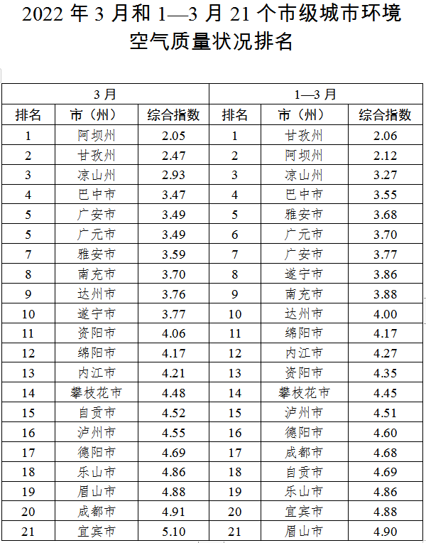 四川省生态环境厅副厅长彭勇通报说,今年一季度,全省21个市级城市环境空气质量综合指数排名从好到差依次为:甘孜、阿坝、凉山、巴中、雅安、广元、广安、遂宁、南充、达州、绵阳、内江、资阳、攀枝花、泸州、德阳、成都、自贡、乐山、宜宾、眉山。