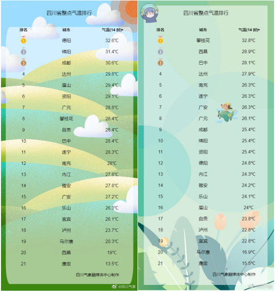 四川各城市5月30日(左)14时与5月29日(右)14时实况气温对比图