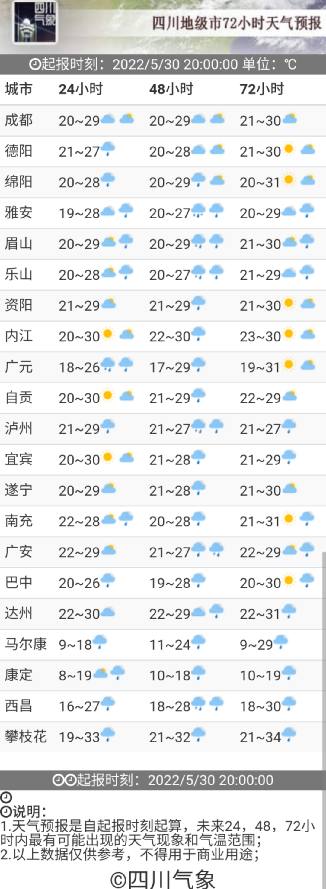 未来72小时四川各地天气预报