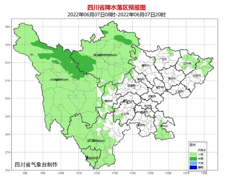 6月7日晚上到8日白天,盆地各市阴天有阵雨或雷雨,雨量小到中雨,个别地方有大雨;川西高原和攀西地区阴天有阵雨或雷雨,雨量小到中雨,个别地方有大雨到暴雨。