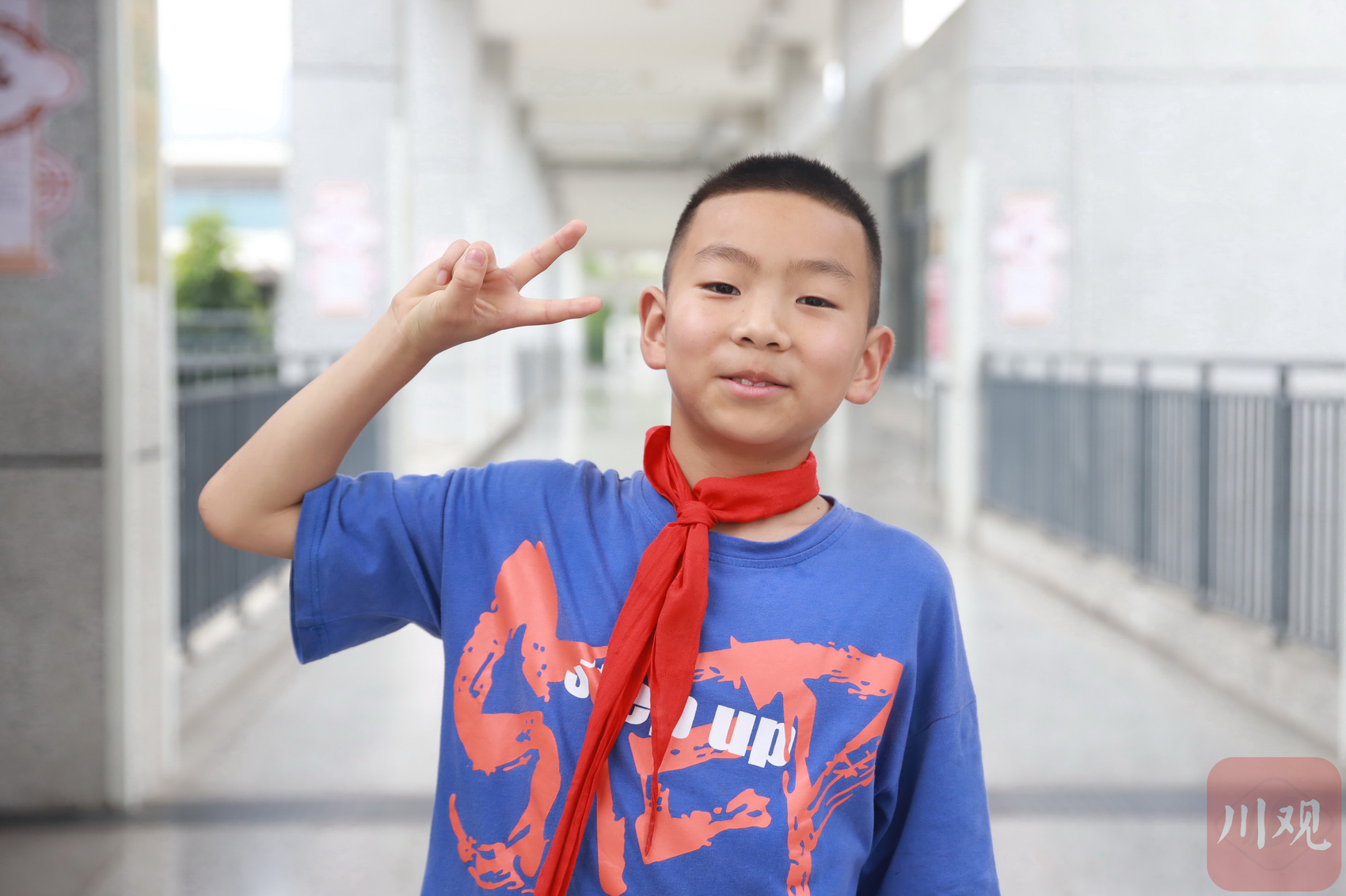 蓝色T恤、红色运动裤、白色跑鞋、佩戴着红领巾,即将11岁的骆俊诚已长成一个活泼俊朗的大男孩。
