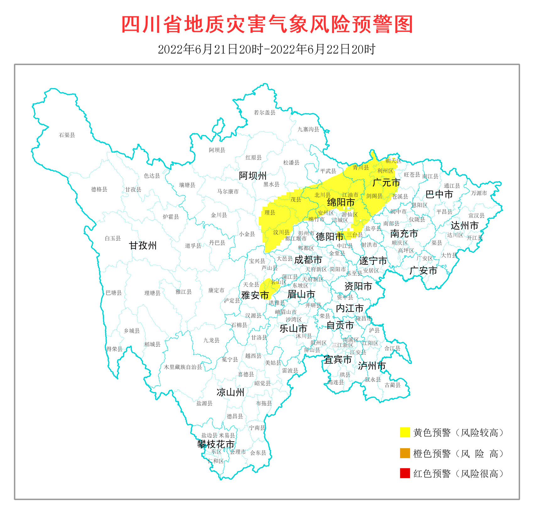 6月21日17时,根据四川省地质环境条件,结合四川省气象台天气预报情况,省地质灾害指挥部办公室发布地质灾害气象风险黄色预警,涉及5市(州)30个县(市、区)。
