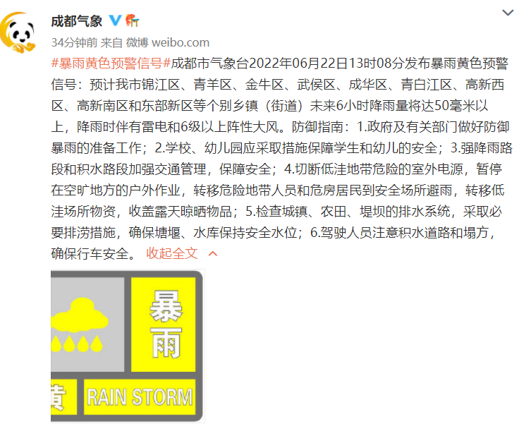 四川新闻网-首屏新闻成都6月22日讯 据成都气象官方微博消息:成都市气象台2022年06月22日13时08分发布暴雨黄色预警信号,预计我市锦江区、青羊区、金牛区、武侯区、成华区、青白江区、高新西区、高新南区和东部新区等个别乡镇(街道)未来6小时降雨量将达50毫米以上,降雨时伴有雷电和6级以上阵性大风。