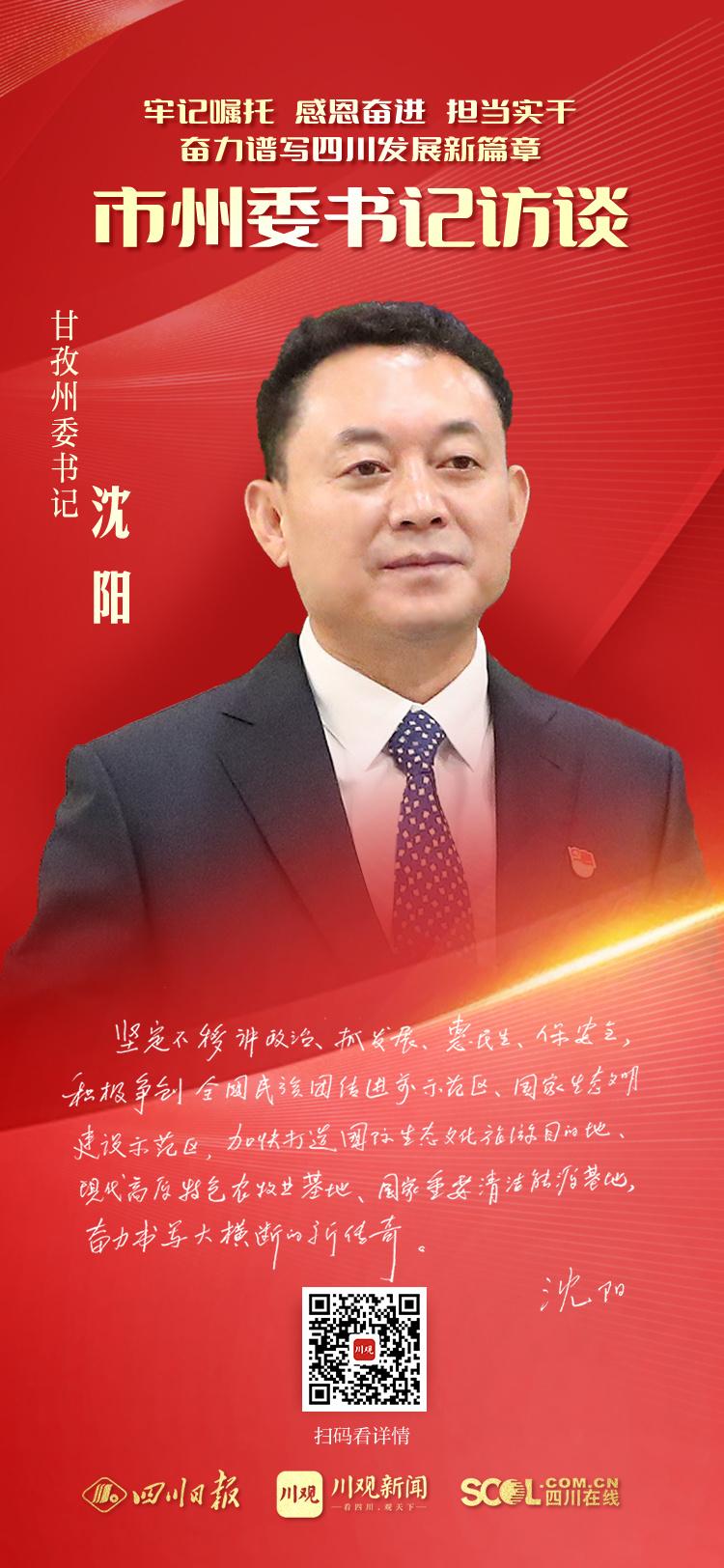 当前,全省上下正深入学习贯彻习近平总书记来川视察重要指示精神,深入学习贯彻省第十二次党代会精神,以赶考姿态推动新时代治蜀兴川再上新台阶,为全面建设社会主义现代化四川努力奋斗。四川各地如何牢记嘱托、感恩奋进、担当实干,奋力谱写四川发展新篇章?6月14日起,四川日报全媒体推出“市州委书记访谈”系列报道,展现各地迈步新征程、建功新时代的新思路、新举措、新路径。敬请关注。