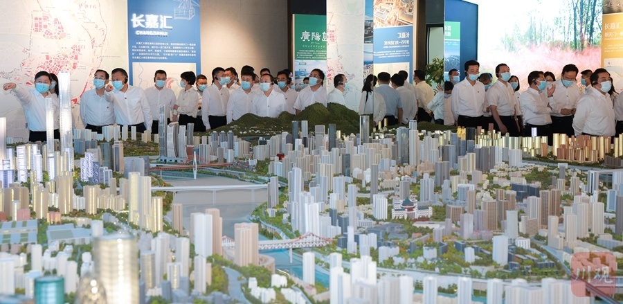 6月29日一早,乘高铁抵达重庆后,参加推动成渝地区双城经济圈建设重庆四川党政联席会议第五次会议的四川代表团径直奔赴考察第一站——位于南岸区长嘉汇广场的重庆市规划展览馆新馆。