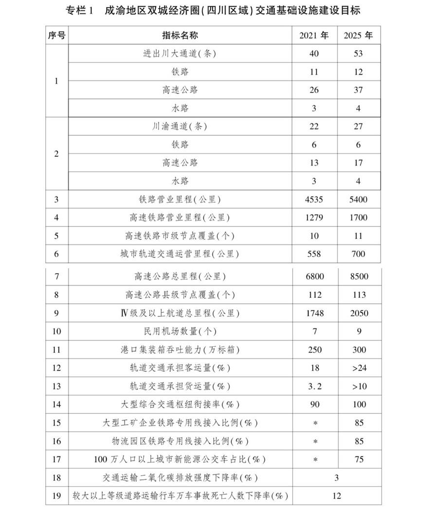 根据《规划》目标,到2025年,成渝地区双城经济圈综合立体交通网络建设取得重大突破,轨道上的双城经济圈初步建成,对外运输通道、城际交通快速网、都市圈通勤网基本形成,交通基础设施互联互通水平大幅提升。进出川综合运输大通道将由目前的40条增至53条,其中川渝之间27条。
