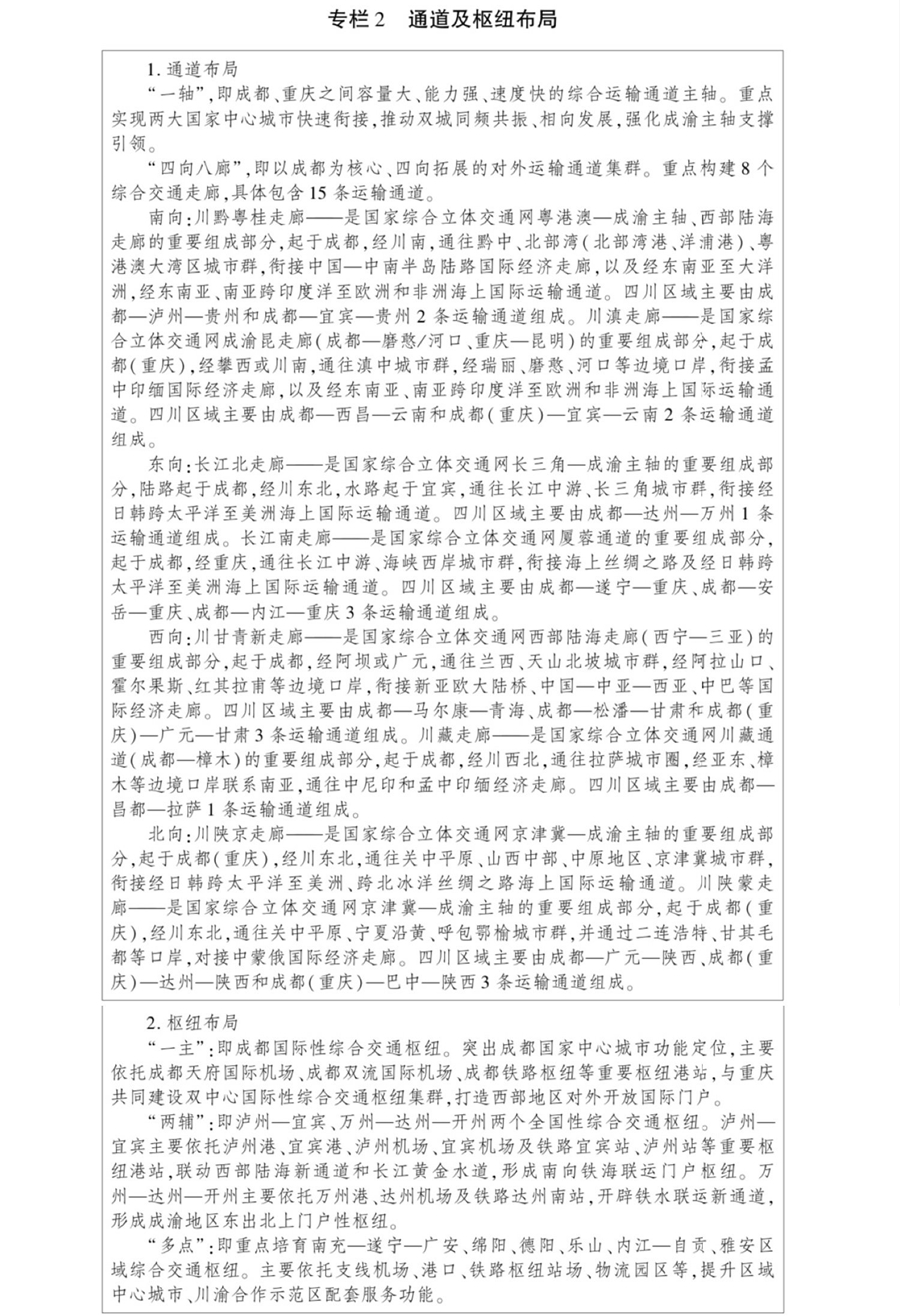 其中,“一轴”是成都、重庆之间容量大、能力强、速度快的综合运输通道主轴,“四向八廊”是以成都为核心、四向拓展的对外运输通道集群,重点构建8个综合交通走廊,具体包含15条运输通道。“一主”即成都国际性综合交通枢纽,“两辅”为泸州—宜宾、万州—达州—开州两个全国性综合交通枢纽,“多点”是重点培育南充—遂宁—广安、绵阳、德阳、乐山、内江—自贡、雅安区域综合交通枢纽。