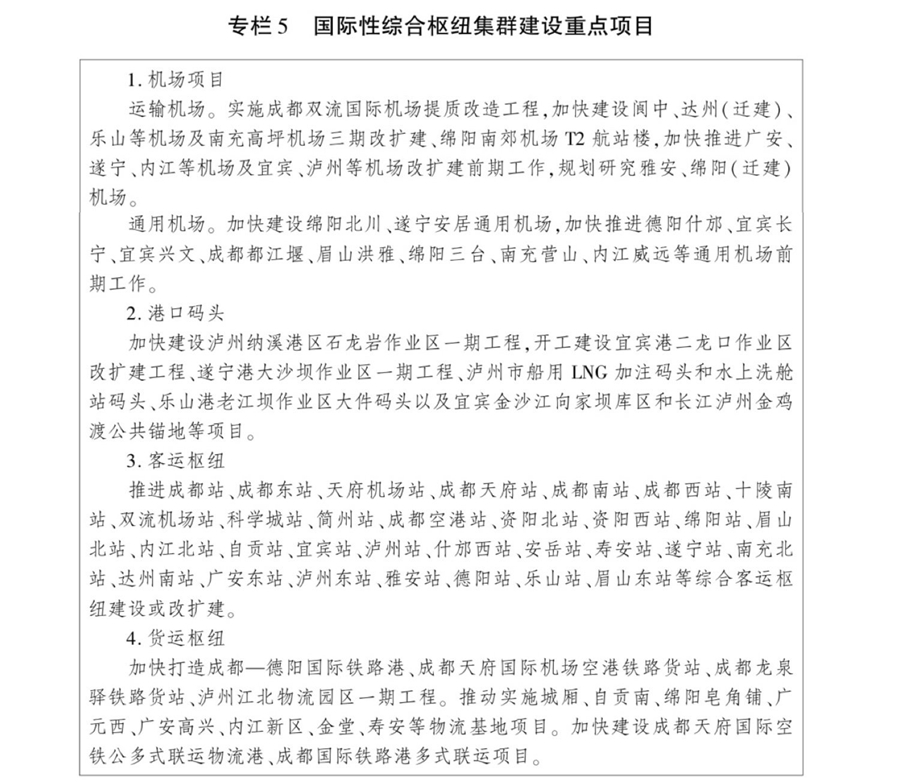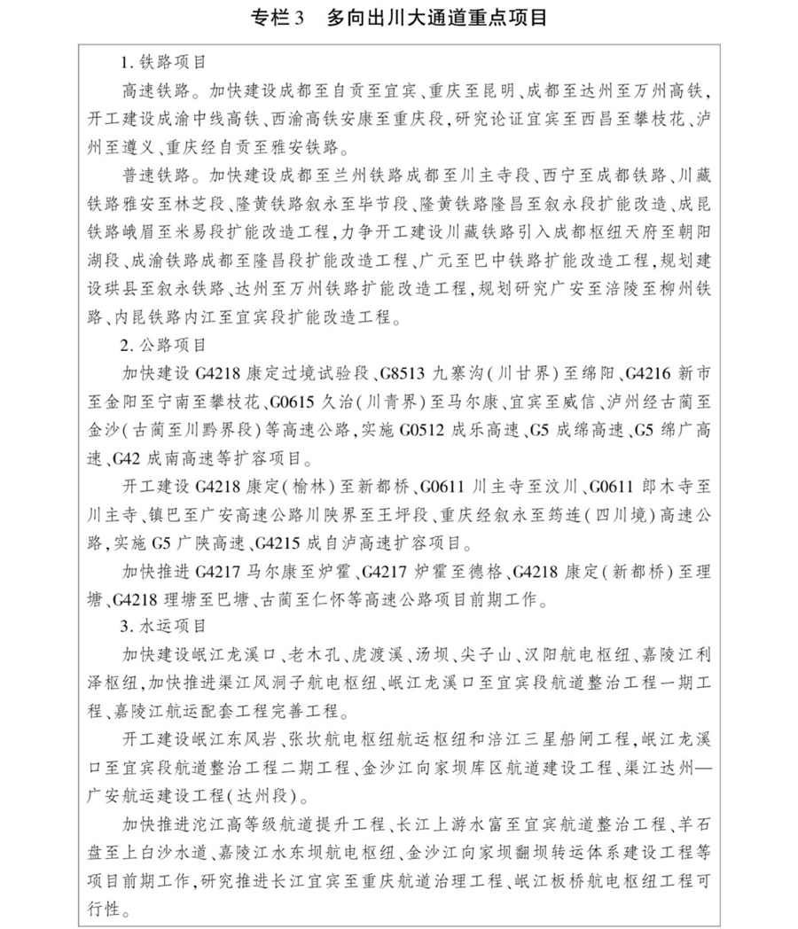 《规划》提出,将重点实施畅通多向进出川运输通道、完善双核辐射综合交通网、建设高水平国际枢纽集群、打造高品质出行服务体系、构建高效率货运物流体系、打造全国智能交通新高地、提升交通绿色安全发展水平、创建一体化协同治理样板等8项重点任务。