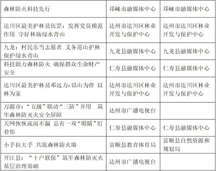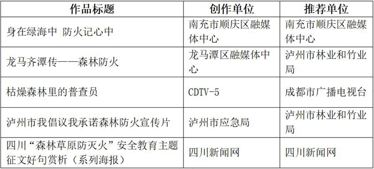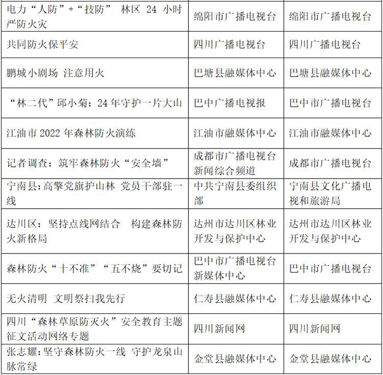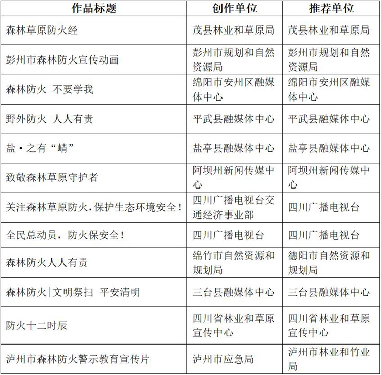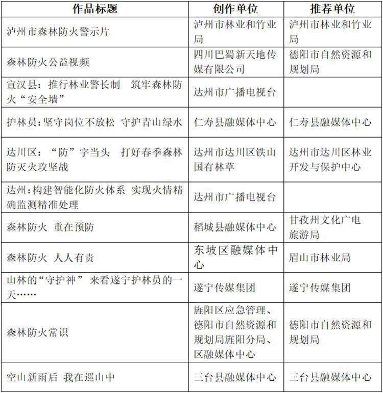 四川新闻网-首屏新闻成都7月2日讯 为激励全省新闻宣传工作者聚焦森林草原防火目标任务,多出精品力作,继续营造森林草原防火良好社会氛围,今年3月,四川省林业和草原局与四川省广播电视局联合启动了2021年度四川省“森林草原防火”优秀宣传作品评选活动。6月28日,评选活动进入专家终评阶段,最终,《身在绿海中 防火记心中》《龙马齐潭传——森林防火》《枯燥森林里的普查员》《泸州市我倡议我承诺森林防火宣传片》《四川“森林草原防灭火”安全教育主题征文好句赏析(系列海报)》等五部作品拟评为一等奖。(后附获奖作品公示名单。)