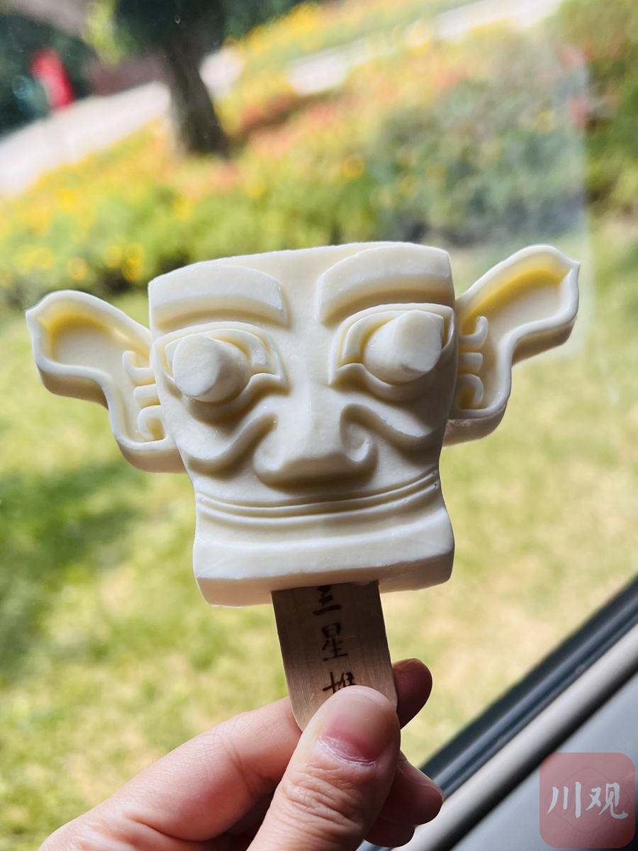 书签、冰箱贴、月饼、帆布袋……在三星堆文创馆,各种形态各异又创意十足的文创产品前围满了不少“粉丝”,三星堆迎来暑期旺季。7月4日,2022 “天府旅游名县巡礼”活动在高人气的三星堆博物馆开启,记者在文创馆看到,几乎人手一根的三星堆文创——青铜纵目面具造型雪糕成为解暑“网红”。