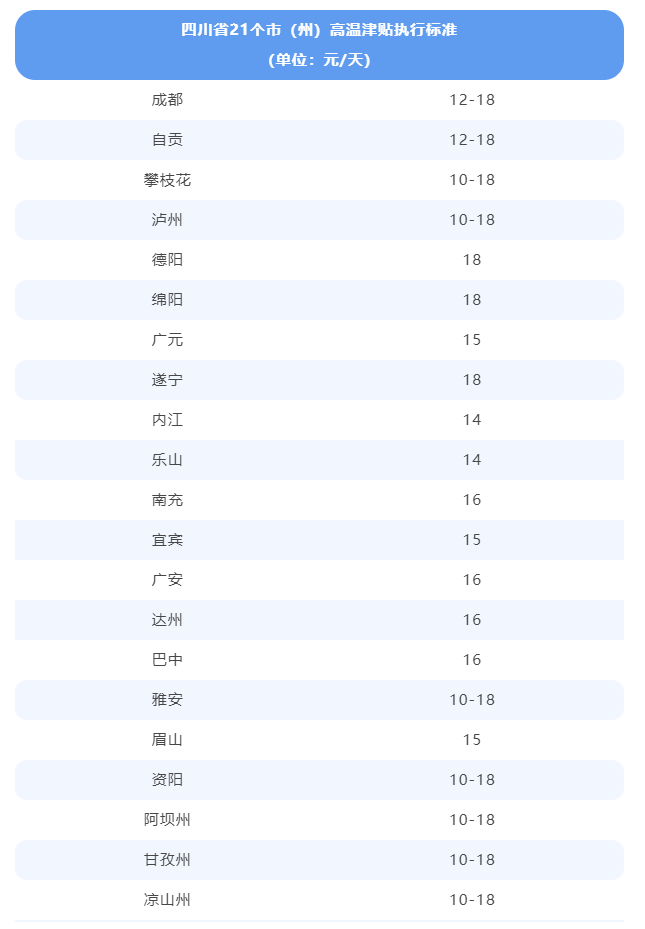 附:四川省21个市(州)高温津贴执行标准(单位:元/天)