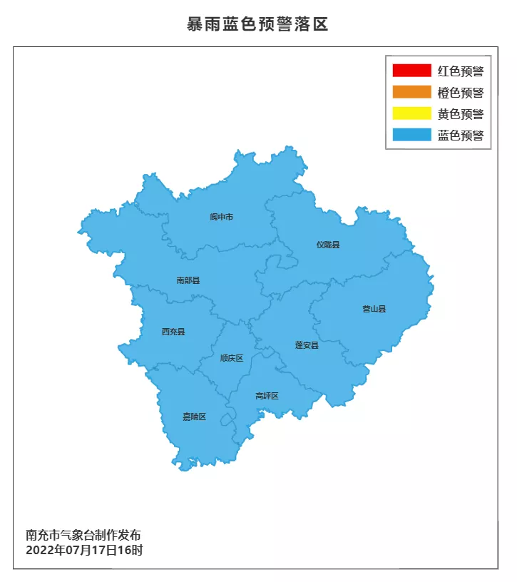 南充市气象台7月17日16时发布暴雨蓝色预警: