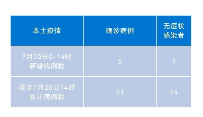 7月20日0-14时,成都市新增本土确诊病例5例,本土无症状感染者1例,均在隔离管控人员中发现。截至20日14时,本起疫情累计报告本土确诊病例31例,本土无症状感染者14例。