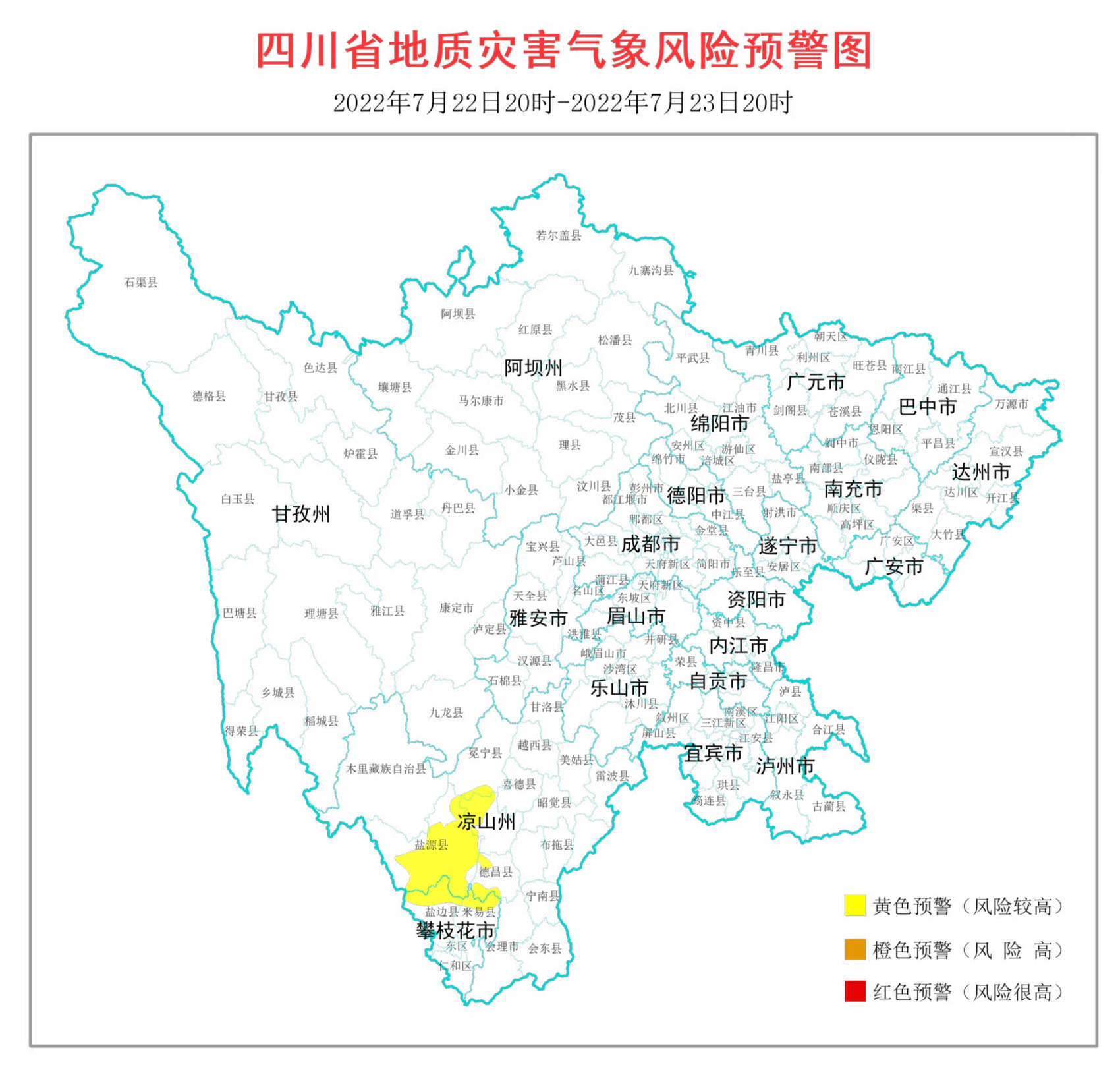 7月22日,根据四川省地质环境条件,结合四川省气象台天气预报情况,四川省地质灾害指挥部办公室发布全省地质灾害气象风险黄色预警,涉及攀枝花市、凉山州7个县(市)。