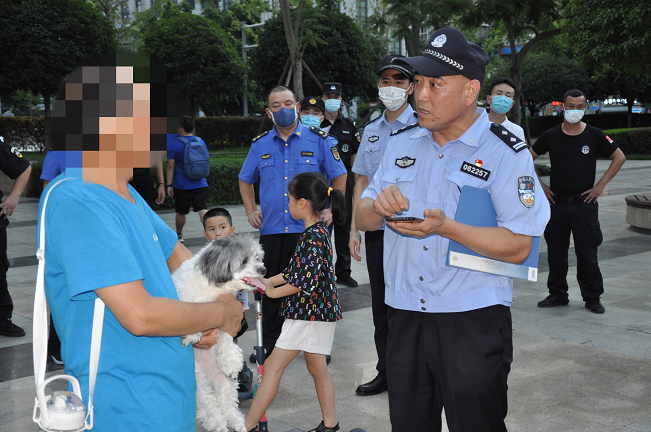 "7月26日晚上,由简阳市公安局牵头,联合市综合行政执法局、市住建局、街办等部门的工作人员,我们一起走上街头,对遛狗不拴绳等不文明养犬行为进行了现场处罚。”简阳市公安局治安户政联勤中心民警杨忠和告诉记者,其实很早之前,他们已进行了大量的宣传、劝导、制止和巡查行动,并联合住建局对小区业主进行宣传劝导,“一大部分市民已经有了遛狗拴绳的意识,但还有少部分人不遵守,或者过段时间又忘了。”
