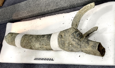 三星堆猪鼻龙头柱状器出坑 满嘴“牙璋” 奇特非凡