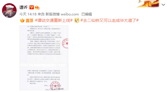 《谭谈交通》维权事件又有新进展。主持人谭乔8月7日在个人微博转发了四川青尚律师事务所的声明,并称“谭谈交通重新上线”。