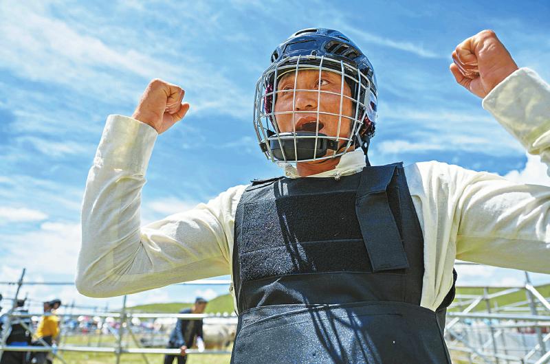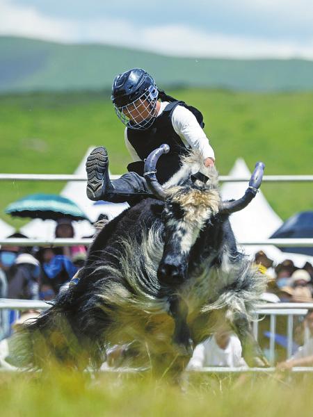 围栏刚一打开,暴躁的公牦牛就迫不及待地冲了出来,在场地里横冲直撞。骑在光滑牛背上的骑手又抓又拽,和公牛展开“决斗”……8月3日,独特的驯牦牛比赛在阿坝州红原县举行,这是当地为丰富红原大草原独特的牦牛文化、展现农牧民群众原生态生产生活方式而举办的文体活动。