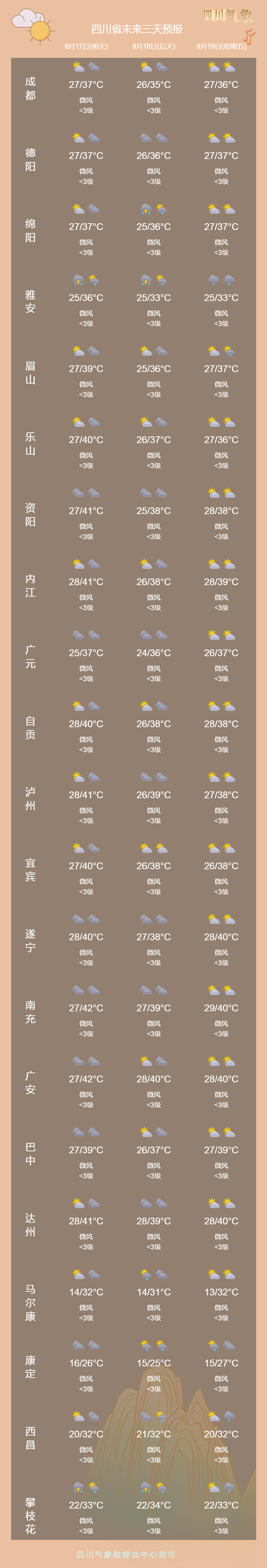 这轮高温还要持续多久?四川省气象台8月16日16时发布72小时天气预报:未来三天,盆地高温天气持续,最高气温西部沿山35~38℃,其余大部地方可达39~41℃或以上;川西高原、攀西地区和盆地西部沿山多分散阵雨或雷雨,局地有短时强降水、雷暴等强对流天气。