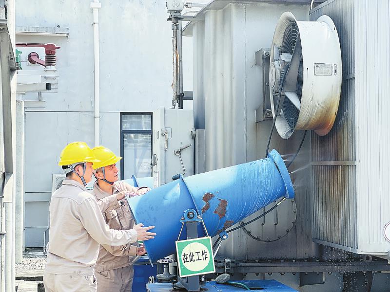 千伏桂溪变电站,检修工人用雾炮机为变压器降温。
