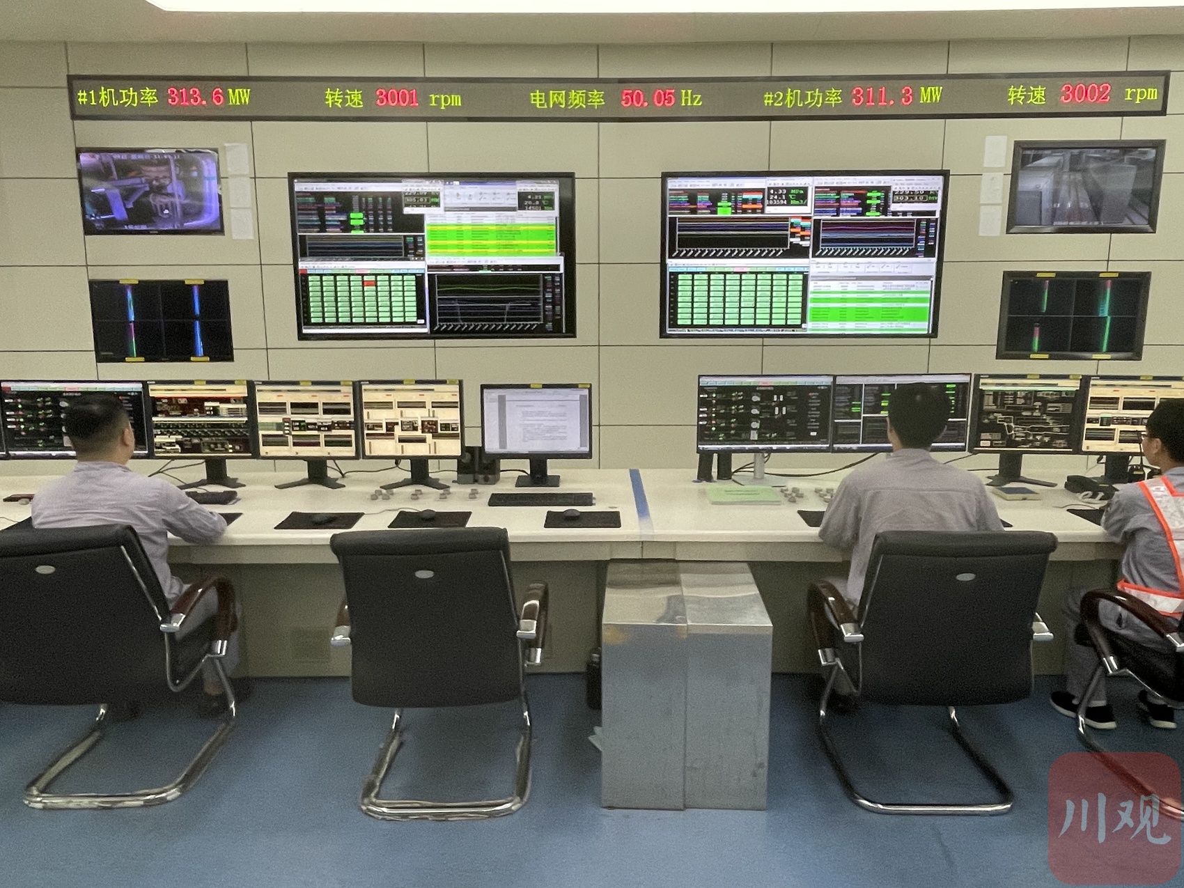 “1#机功率313.6MW,2#机功率311.3MW”,集中控制室屏幕上实时显示两台机组的发电功率。在记者盯着屏幕的2分钟时间里,两台发电机组的功率稳定在“310MW”上下。