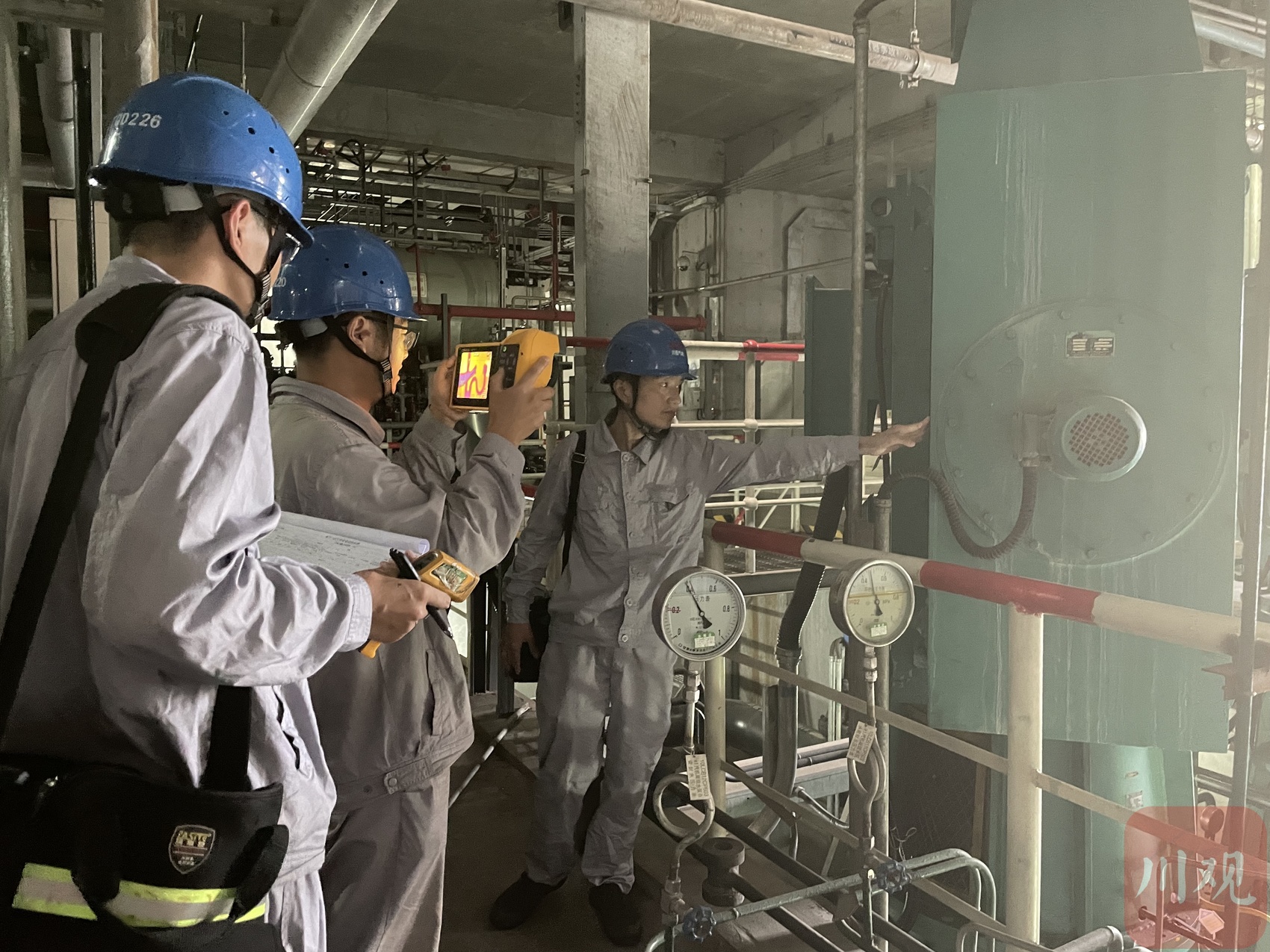 采访过程中,正值该公司当天白班第二次巡检,工作人员邹文广与两名同事一起,使用红外测温仪逐一对厂房内的电机、水泵轴承温度等设备进行检测。“环境持续高温,设备也容易‘中暑’,时刻监测以便采取应对措施。”邹文广说。