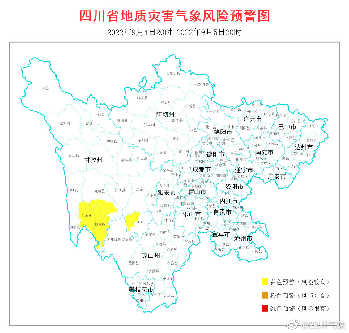 9月4日,四川省气象台继续发布地质灾害气象风险预警:9月4日20时~9月5日20时,甘孜州南部发生地质灾害的风险较高。请上述地区加强地质灾害防范工作。
