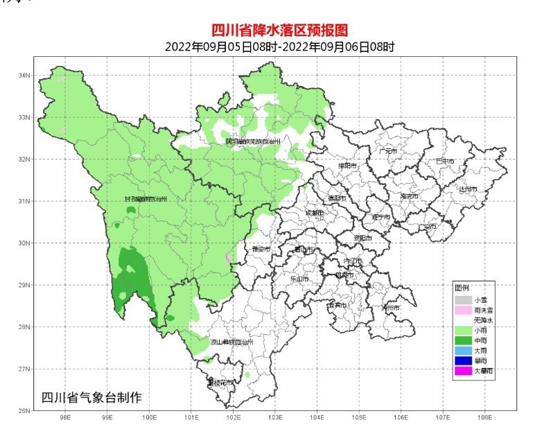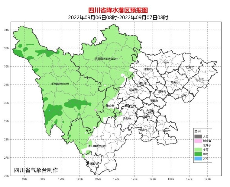 6日白天到晚上,盆地各市多云;川西高原和凉山州西北部阴天间多云有阵雨或雷雨,其中甘孜州局部有中雨,攀西地区其余地方多云。