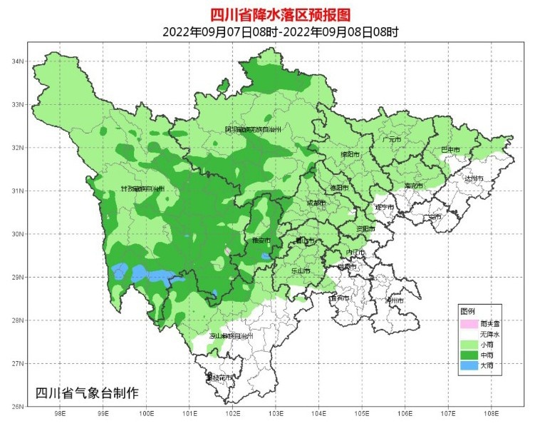 7日白天到晚上,盆地大部多云转阴天,部分地方有小雨或阵雨,其中雅安有中雨;川西高原和凉山州北部阴天间多云,部分地方有阵雨或雷雨,雨量小到中雨,其中甘孜州西南部有大雨,攀西地区其余地方多云间阴。