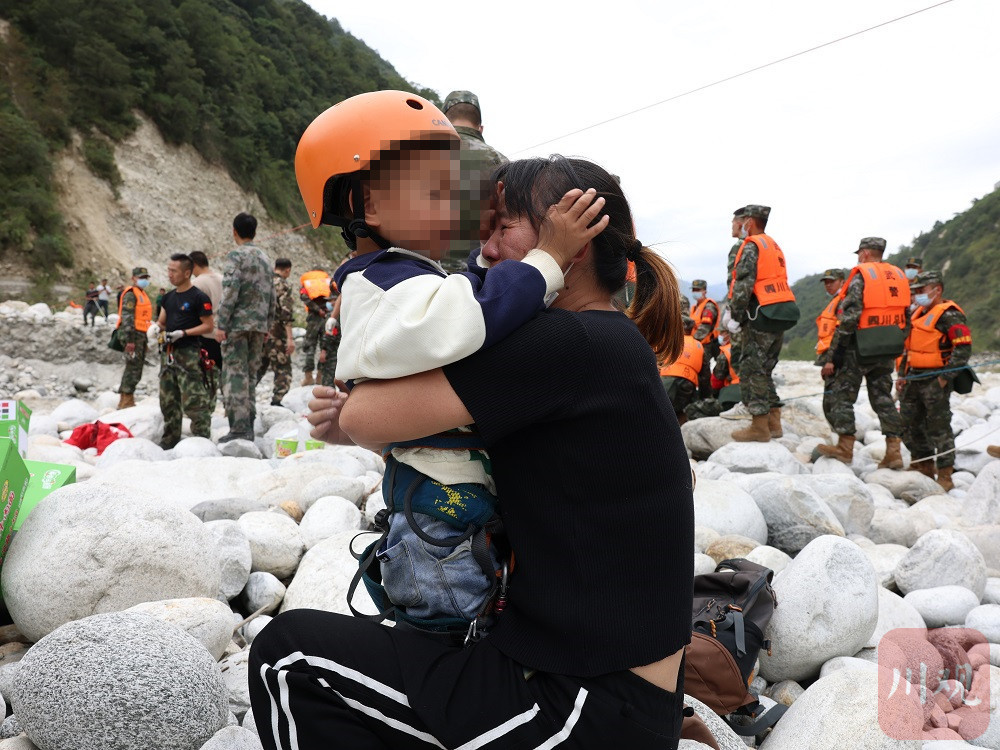 9月6日12时16分,磨西镇共和村救援人员顺着搭好的溜索,成功将一位被困的4岁小男孩安全滑至观音角对岸,这是共和村第一位被解救的被困人员。“妈妈好想你。”河坝对岸,地震时正好在磨西镇的母亲张建敏早已焦急地等待,拥抱到孩子的那一刻,母亲喜极而泣。