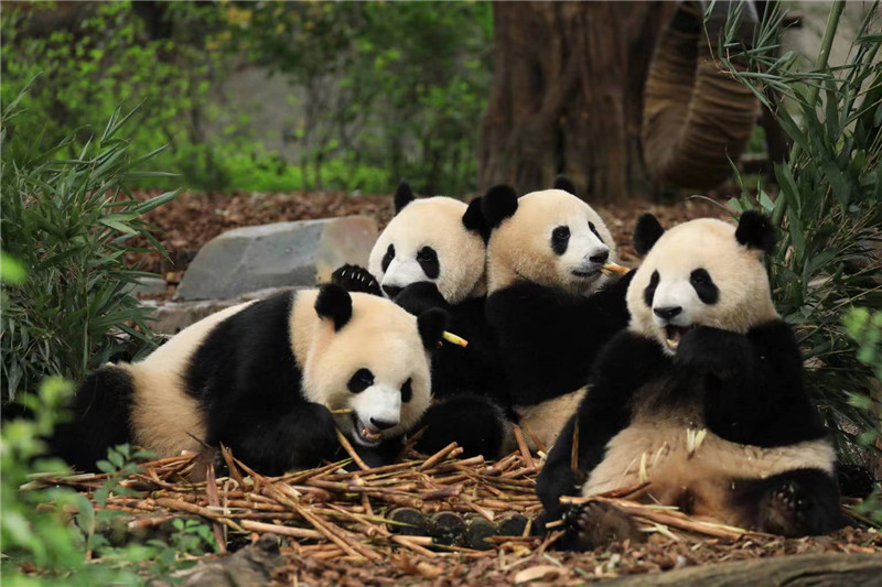 没有了燥热的熊猫基地,等待游客的是2022级新生大熊猫幼仔,多日不见的它们现在都长大了许多,不少熊猫宝宝已经戴上了墨镜,每天都在太阳产房和月亮产房里的木床上香甜地睡觉,或者开展“定格式”运动会;春生、热干面、蛋烘糕和香果围坐在一起,享用着鲜嫩可口的竹笋;“大明星”和花靠着木架打着盹,期待着谭爷爷为她和小伙伴们准备的美味窝窝头;附近的小熊猫们也在属于他们的树林里追逐打闹;偶尔一两只孔雀慢悠悠从树下走过,展现着属于成都独特的悠闲生活。