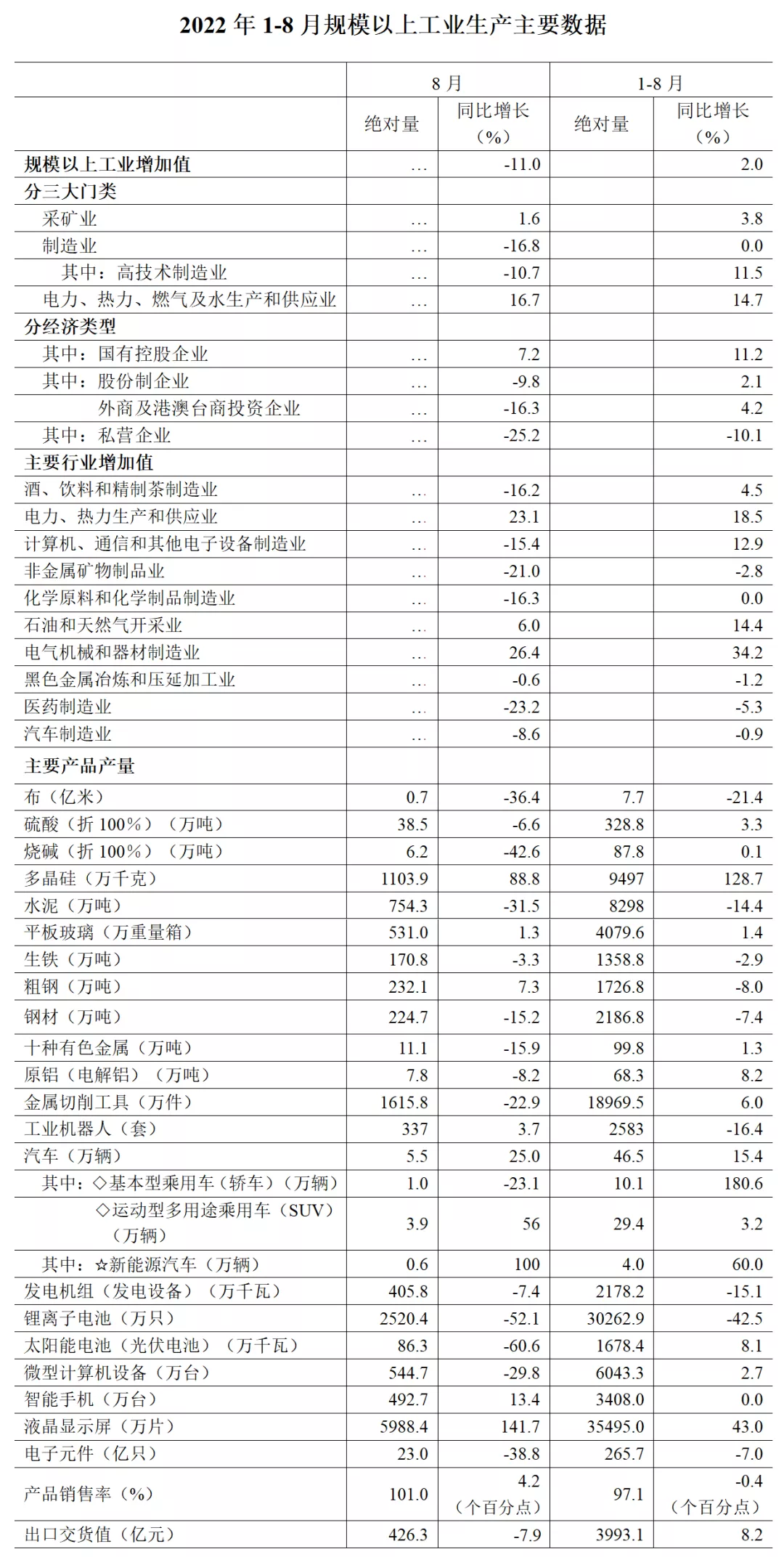 分三大门类看,8月份,采矿业增加值同比增长1.6%,制造业增加值下降16.8%,电力、热力、燃气及水生产和供应业增加值增长16.7%。