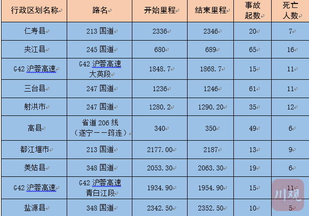 10月1日,川观新闻记者从四川省公安厅交通警察总队获悉,国庆已至,为进一步预防和减少道路交通事故的发生,保障人民群众生命财产安全,公安厅交警总队对近3年来的道路交通事故进行了集中统计分析,梳理出了“十大交通事故多发路段”。数据显示,3年来,这10段路共发生302起交通事故,导致94人死亡,令人痛心。