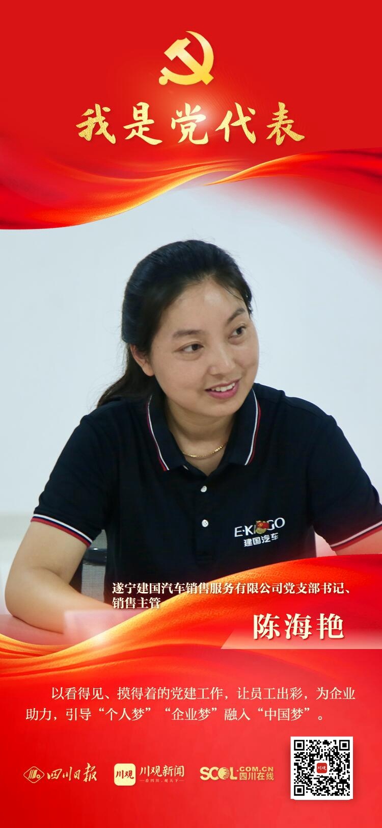 陈海艳,2013年6月加入中国共产党,现任遂宁建国汽车销售服务有限公司党支部书记、销售主管。2020年被评为四川省劳动模范。