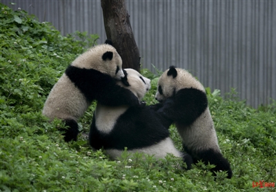 卧龙自然保护区,大熊猫珍珍和她的两个宝宝在草地上玩耍 摄影记者 陶轲 王红强