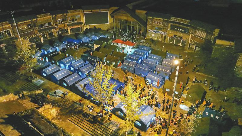 2022年9月5日,泸定6.8级地震发生当晚,泸定县磨西镇贡嘎广场的临时安置点灯火通明。看到蓝色帐篷上的党旗,群众的心就稳了。川观新闻记者 吴聃/摄