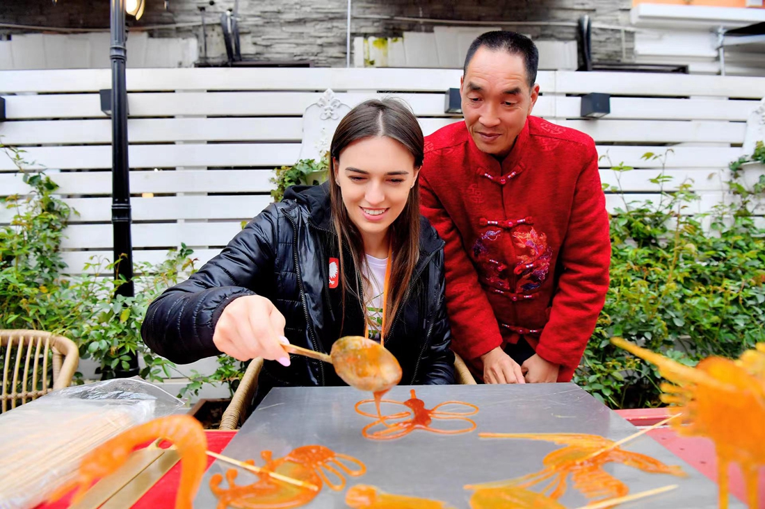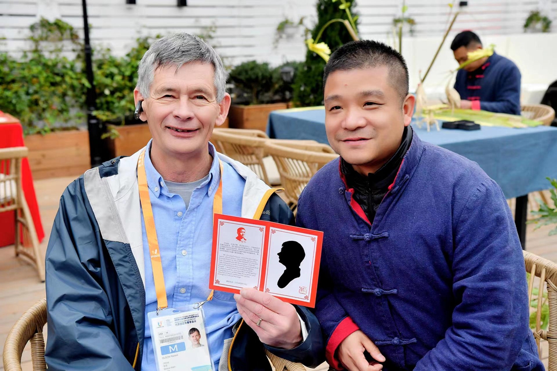 当天,代表团一行还前往白鹿玫瑰音乐广场、音缘桥和樵人街、兴鹿街等地,了解这座中国版“霍格沃兹”小镇百年文化和发展特色,互动体验非遗项目和体育场景。其中,非遗项目体验尤其引人注目,精美的剪纸、可爱的糖画、溢香的白茶、栩栩如生的竹编,琳琅满目的非遗手工艺品令国际友人们目不暇接,不停举起手机拍照记录。在非遗工匠的耐心指导下,代表团还亲手尝试了糖画和剪纸的制作过程,近距离感受指尖非遗技艺的独特魅力。代表团对彭州白鹿展现出的中国风格、巴蜀特色、青春风采给予高度评价,并纷纷表示希望大运会举办期间再来彭州白鹿进行深度文化体验。