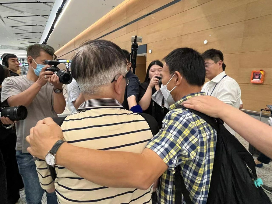 刘德文刚走到航站楼出口,76岁的唐清宁和73岁的唐清泽就激动地迎了上去,紧紧握住刘德文的双手。“唐爷爷,回家了!”话音刚落,刘德文取下肩上的背包,停在原地双膝跪地,小心翼翼地从里面取出唐毅奇的骨灰盒。