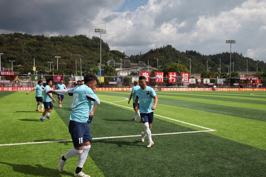 在比赛现场,“超级星期舞”开官之战——彭州九尺板鸭队与榕江场坝足球队的比赛开哨打响后,比赛现场,彭州九尺板鸭队发起强势进攻,率先破局。比赛到中途,暴雨突至,双方球员丝毫不怯、现场观众支起临时帐篷、直播人员合打一把伞,赛场内外充满着对足球这项运动的纯粹热爱,成就了一场异彩纷呈的比赛。四川彭州九尺板鸭队坚持进防并举,最终以5比3的比分,赢得比赛。