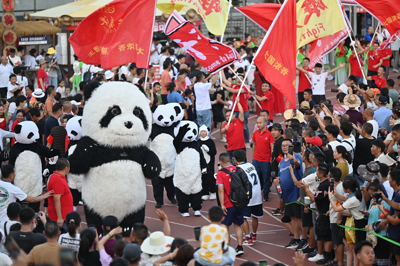 中场休息时,开江籍歌手张天龙现场带来了一场主题为《蜀都》的巴蜀历史文化展演,将巴蜀文化带到“村超”大舞台,憨憨的大、小熊猫更是“圈粉”无数。