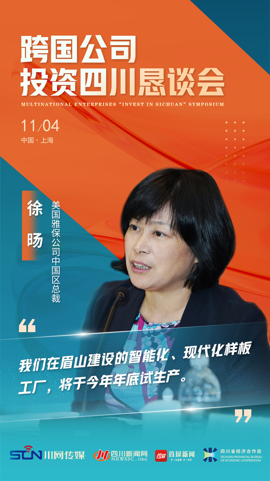 四川新闻网-首屏新闻上海11月4日讯(记者 陈淋)“看好四川未来发展,公司决定将投资总额从5亿美金增加到9亿美金。同时,公司将在两年内增加新的注册资本1.3亿美元。”11月4日,跨国公司投资四川恳谈会在上海举行,美国雅保公司中国区总裁徐旸在会上透露最新动向。