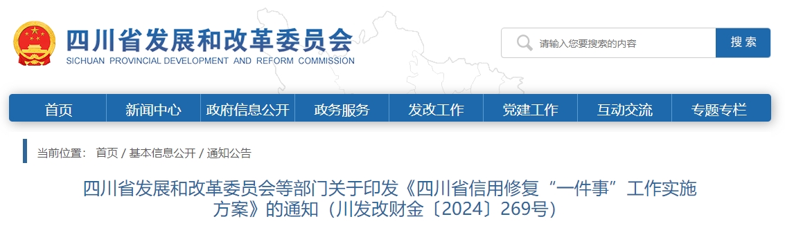 记者从四川省发展和改革委员会网站获悉,为深入推动政务服务提质增效,加强信用修复协同联动,在信用修复领域实现“高效办成一件事”,日前,四川省发展和改革委员会等9部门联合印发《四川省信用修复“一件事”工作实施方案》(以下简称《实施方案》),自2024年8月1日起实施。