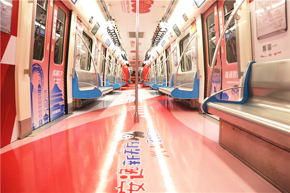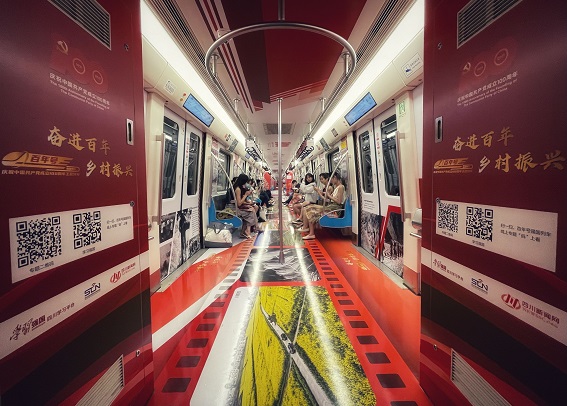 主题列车各节车厢以清新简约为主要设计风格,以线条、大色块、中国风作为主要设计元素,融入四川文旅景点、巴蜀文化等四川元素装饰纹样,呈现了交通先行、乡村振兴、经济合作等“四川百年变化”。