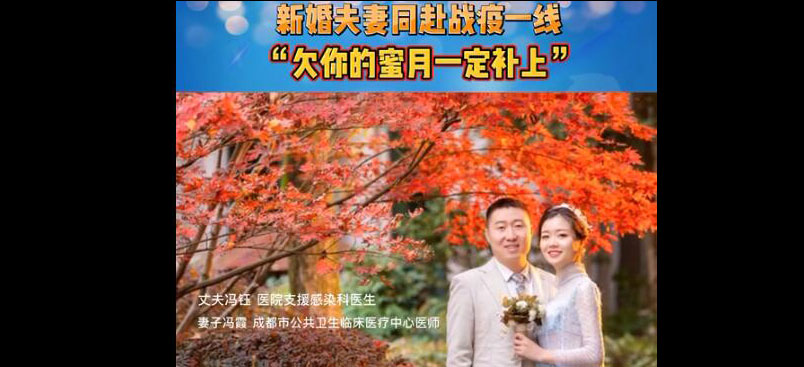 “老婆,老公陪你一起,奋战一线,和成都、武汉和全国人民一起,共渡难关!欠你的新婚蜜月,以后一定补上,加油!”这条信息来自于成都医学院第一附属医院血液科冯钰医师的微信朋友圈,是他向同样奋战在一线的新婚妻子冯霞的真情“表白”。
