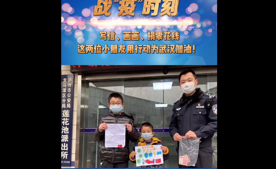 两名小朋友,在家长的陪同下,来到了派出所。给警察叔叔送上了一封信和他们创作的一幅画,还有603元零花钱。画上写着“中国加油!武汉加油!”