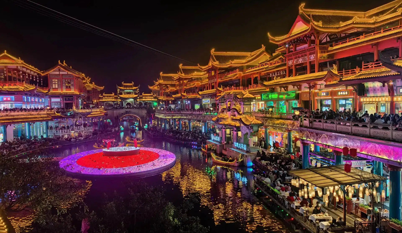 正月初七,春节假期最后一天,眉山东坡印象水街游人如织,灯火璀璨中,年味依旧浓郁。
