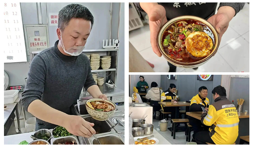 临近中午,位于龙潭路8号的8号素椒面店里的顾客不少。几分钟后,热气蒸腾的面碗端到了一位外卖骑手面前。外人不会注意,在素椒杂酱一旁,总会放着一个金黄焦香的煎蛋。这是面店老板与外卖骑手、环卫工之间的默契。