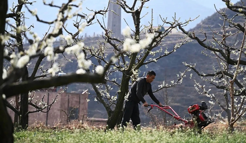 2026年3月12日,记者在四川省阿坝藏族羌族自治州茂县凤仪镇坪头村看到,大片李花竞相绽放,当地村民利用晴好天气在李花丛中劳作,好一幅生动的春耕图景。
